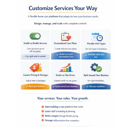 Run your home care business on your terms with a platform that adapts to you. Create personalized care plans, set visit types, durations, and pricing, and adjust services anytime. Scale effortlessly while keeping operations smooth, efficient, and fully customized for exceptional care.
